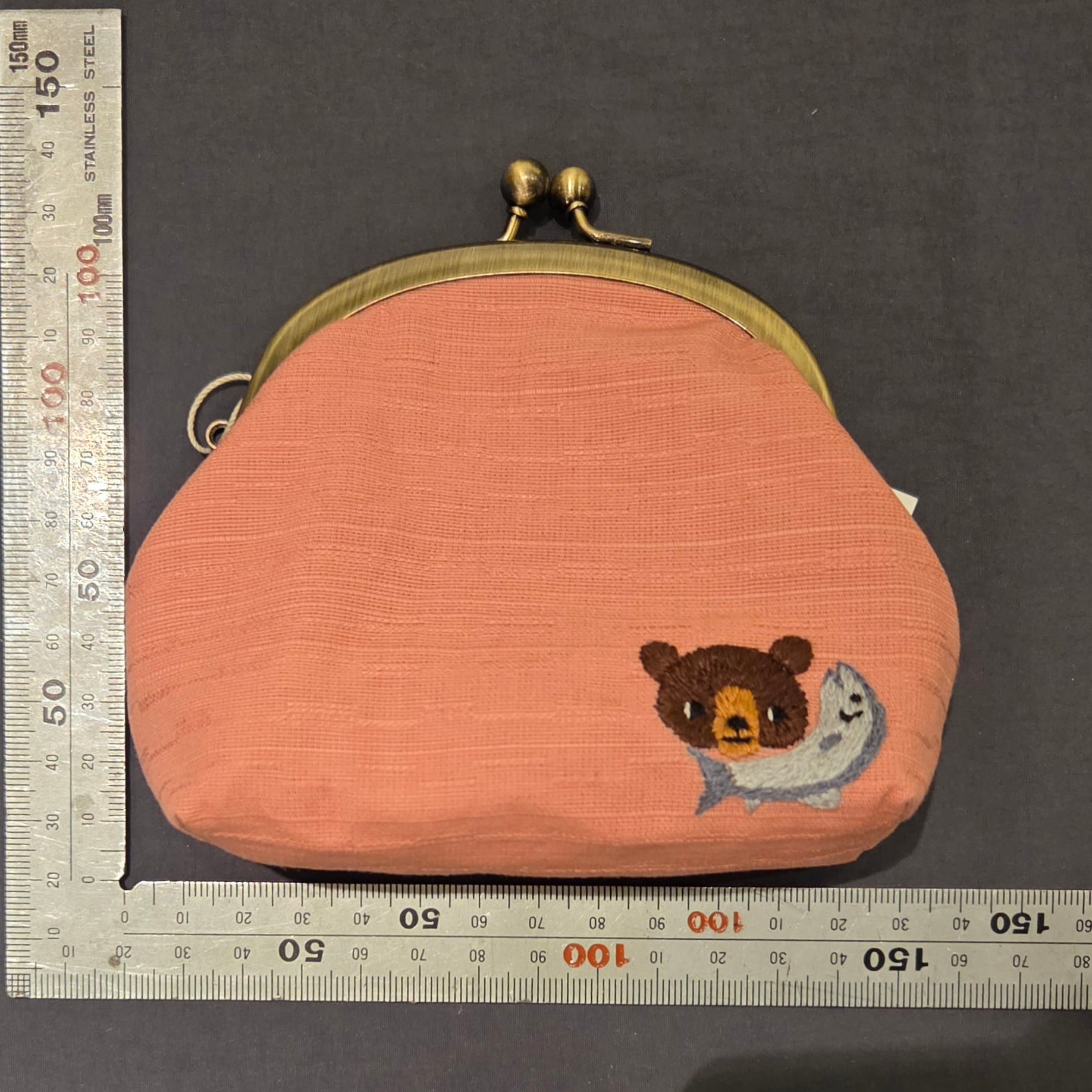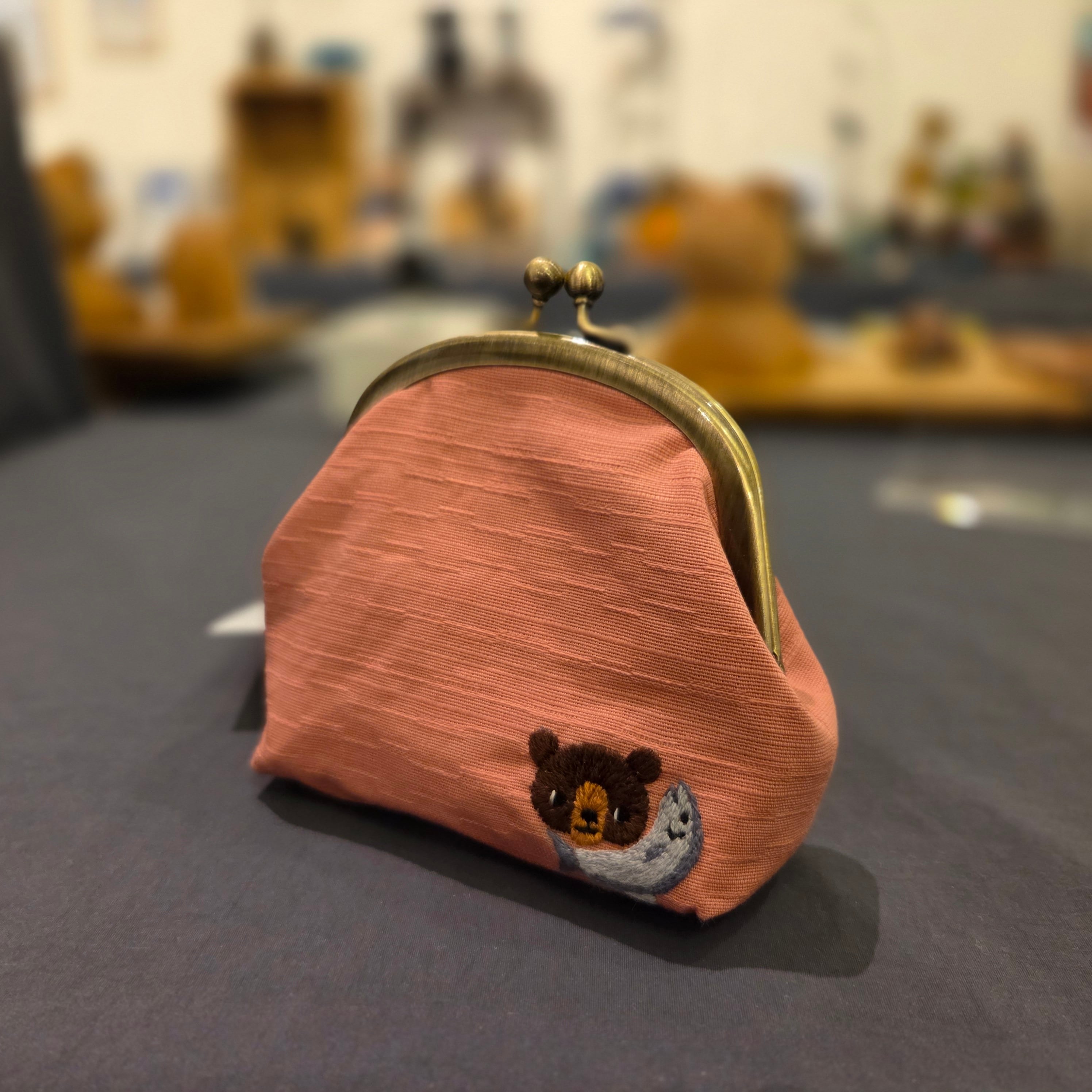 ・作品名:ラウンドポーチくま×鮭 ピンク